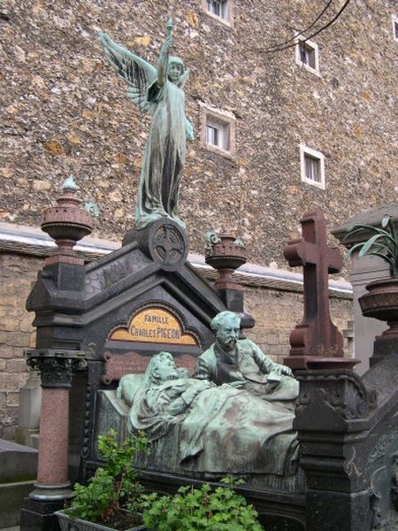 Cimetière du Montparnasse 22e division, une tombe de marbre originale et pleine de tendresse : les deux époux Pigeon, Charles-Joseph et sa femme Marie, y sont représentés en tenue de ville sur un lit à colonnades.